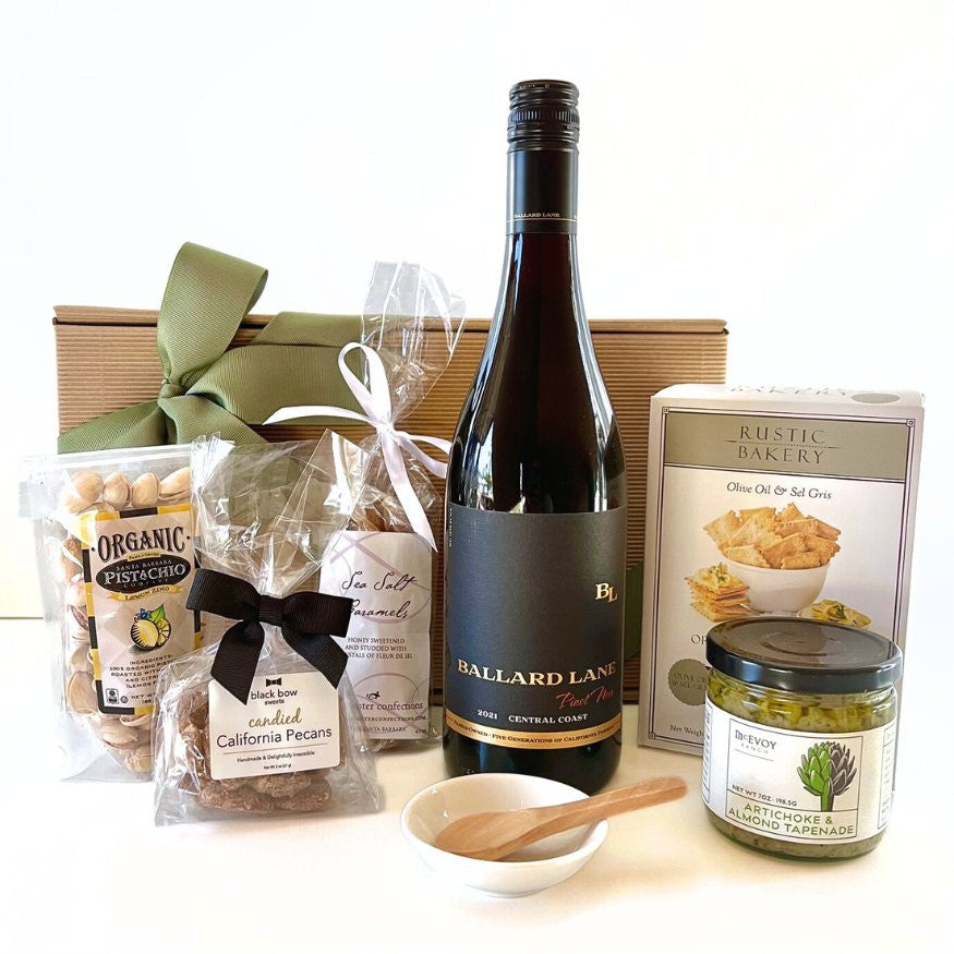Indulge your recipient in an unforgettable wine happy hour experience with the California Pinot Noir Wine Box! Our expertly curated selection of award-winning Central Coast Ballard Lane Pinot Noir, gourmet crackers & tapenade, Santa Barbara pistachios, Jessica Foster's sea salt caramels and California candied pecans, plus a white ceramic dipping dish & wooden spoon, is sure to make an impression!