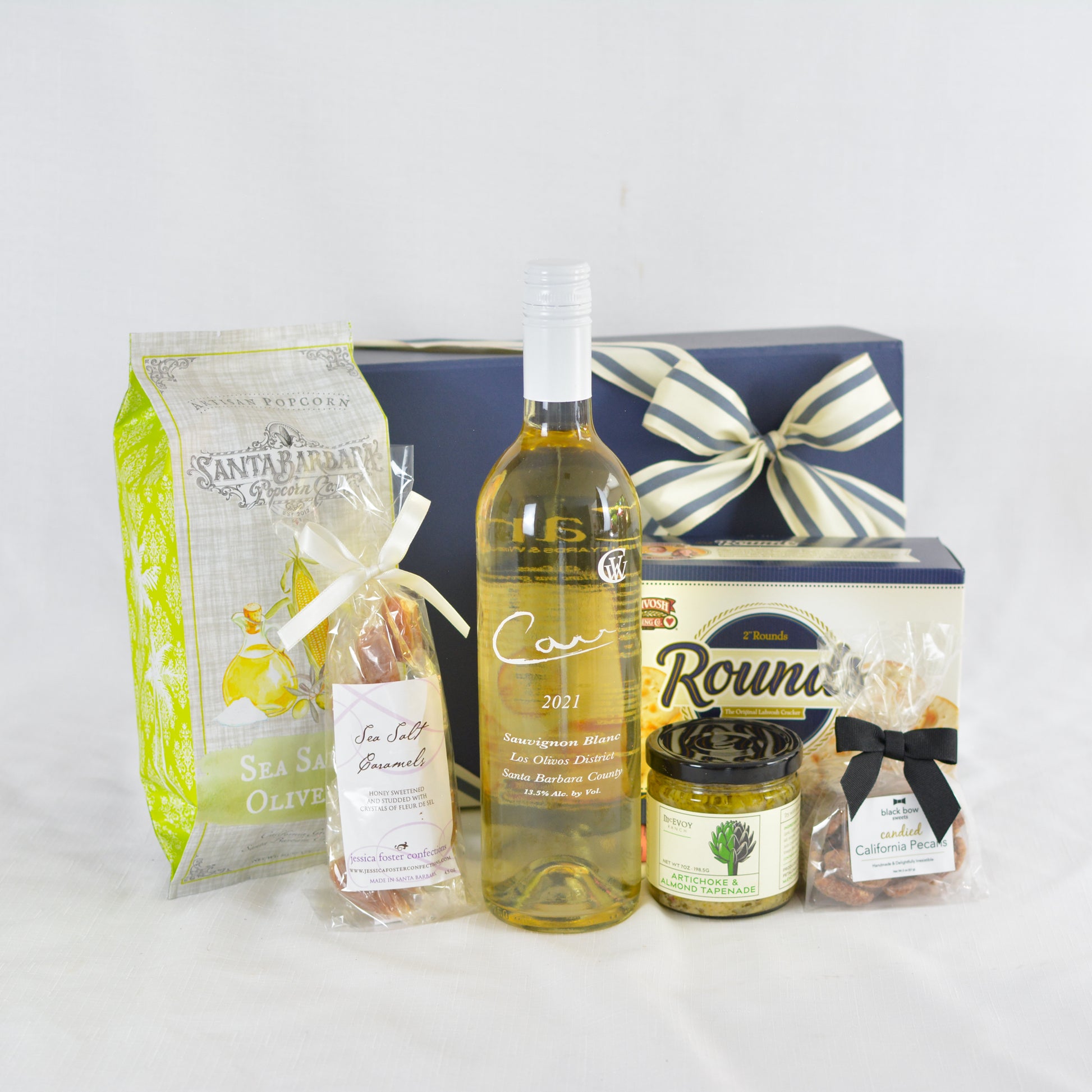 Experience the exquisite flavors of the Carr Sauvignon Blanc Gift, featuring our fan-favorite artichoke & almond tapenade, savory lahvosh crackers, irresistible candied California pecans, heavenly sea salt caramels, and delectable Santa Barbara Popcorn.