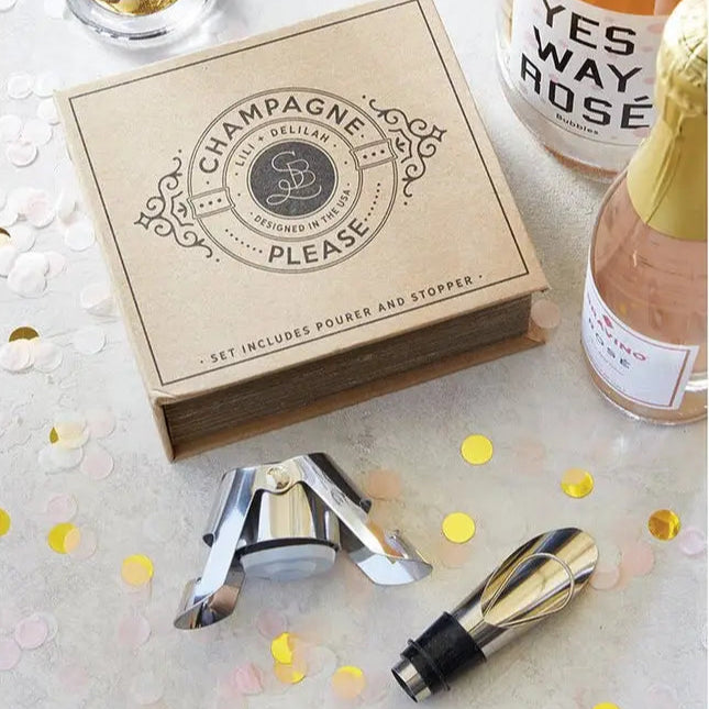 Keep your sparkling beverages fresh and easy to serve with our elegant champagne stopper and pourer. Made from stainless steel and packaged in a sleek cardboard gift box, it measures 5" W x 4.5" H x 1.75" D. For lasting quality, hand wash only. This stylish set ensures every sip of your bubbly is perfectly preserved and poured.