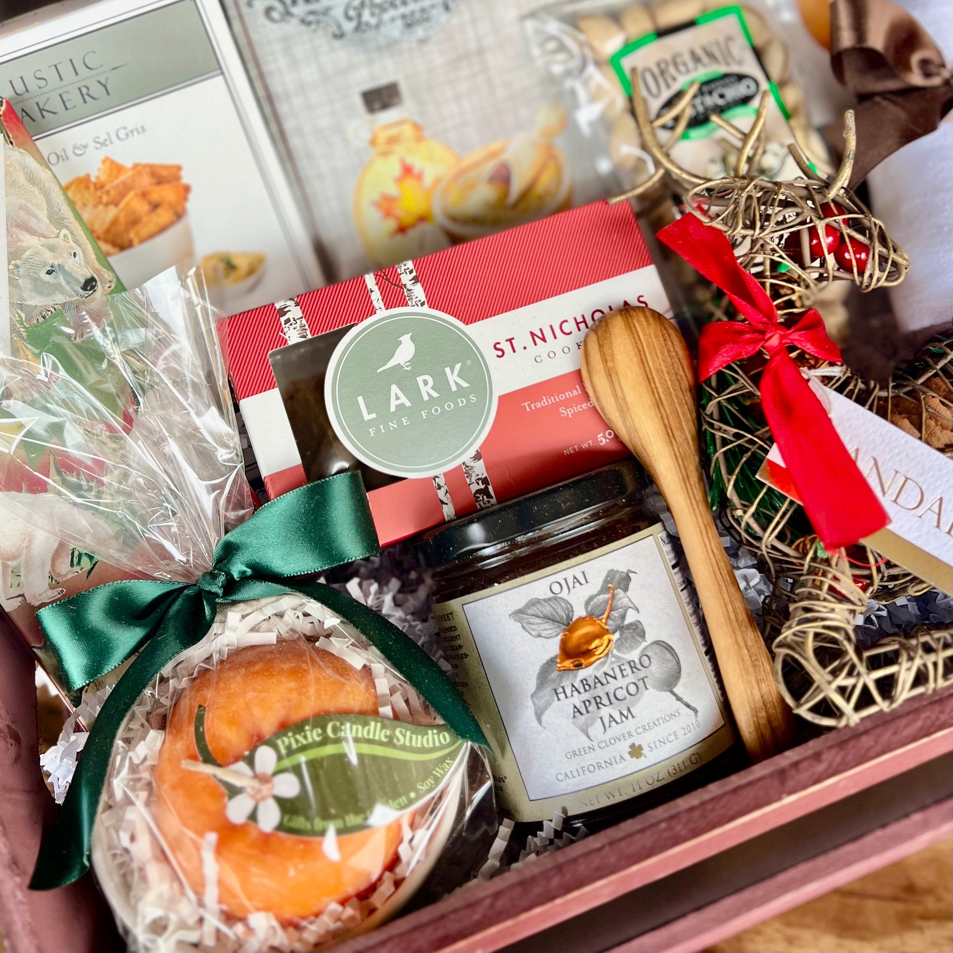 Surprise your favorite foodie with this festive Deer Santa Crate! Packed with Ojai Pixie Candle, Ojai Pepper Jelly, sourdough crackers, fruit cake crisps, St Nicholas cookies, peppermint chocolate, Santa Barbara popcorn, and pistachios. Bonus: olive wood spoon, tea towel, and an adorable holiday deer ornament stuffed with potpourri. Pure holiday magic in one gorgeous box.