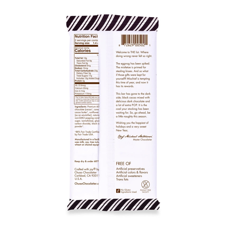 Naughty never tasted so good. This cheeky treat transforms the classic lump of coal into something genuinely delightful—dark chocolate infused with bold black cacao powder and studded with popping candy that crackles on your tongue. Perfect for stocking stuffers or rewarding your mischievous side this holiday season. At 2.8 oz, it's the naughty-list essential that actually belongs in your mouth. Embrace the mischief.