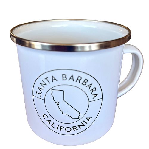 Santa Barbara Camping Mug. Cozy around the fire with a 12 oz enamel camping mug. Lightweight stainless steel with rounded corners. Dishwasher safe. Not microwave safe.